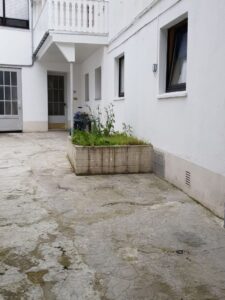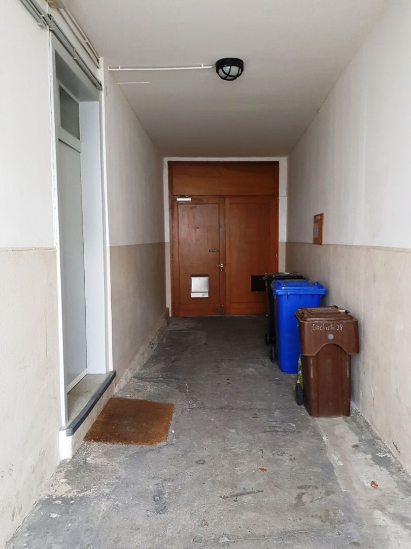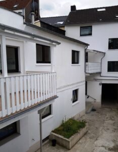 Das nicht unterkellerte Hinterhaus, mit ebenfalls separatem Eingang über den Innenhof, einem weiteren Eingang über den Kiesweg als auch einem separaten Stellplatz, umfasst eine Wohneinheit von ca. 102 m², einschl. überdachtem Balkon, plus einer ca. 30 m² große Garage, inkl. sanitärer Einrichtung, welche auch als Lager genutzt werden kann.